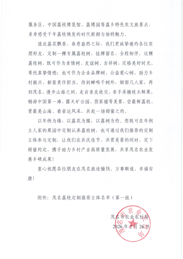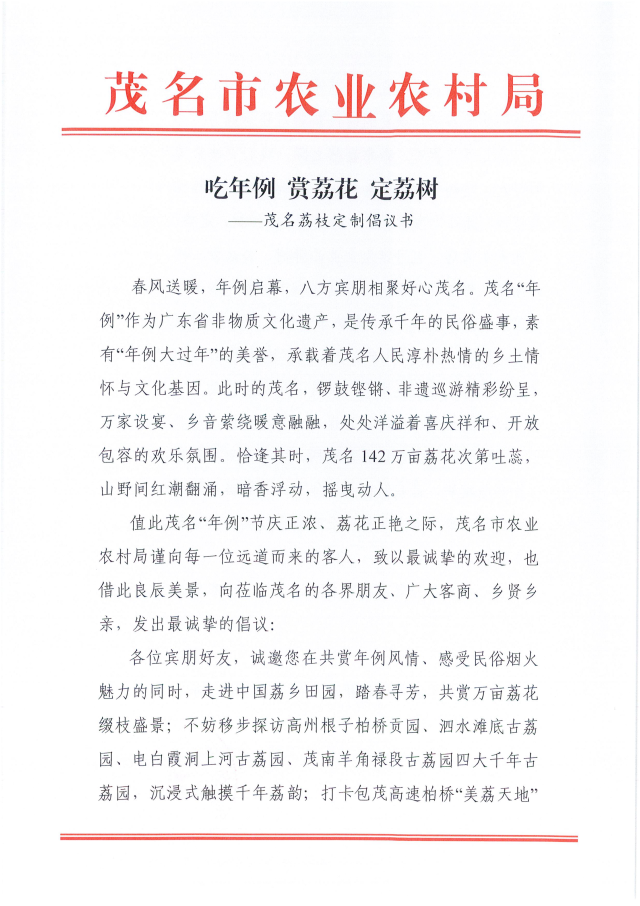 “把春天的约定留在茂名,把盛夏的甜蜜寄予枝头,共赴一场跨越四季的荔乡之约。”2月26日,茂名市农业农村局发布“吃年例赏荔花 定荔树”茂名荔枝定制倡议书(以下简称“倡议书”)。