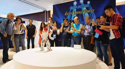 ▲在美的全球创新展示中心,来自世界主流媒体的记者们在参观会玩魔方的机器人。