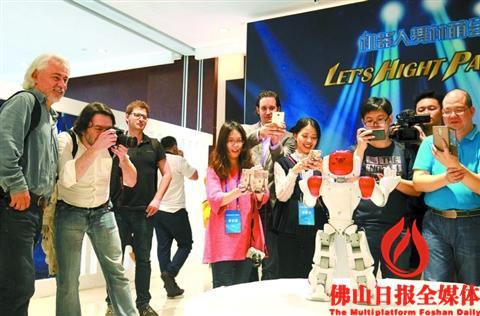 昨日,在佛山新城中欧中心,国内外主流财经媒体记者兴致勃勃地参观拍摄会唱歌跳舞和说话的机器人。/佛山日报记者甘建华摄