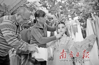 近日,华光诞活动的“粤玩·越有趣”互动体验环节中,工作人员帮助一个喜欢粤剧的小女孩穿上粤剧花旦演出服装。戴嘉信 摄
