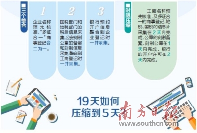 具体来说,佛山把企业名称预先核准、“多证合一”商事登记、补采集国、地税部门税务登记信息、刻章备案及印章刻制点刻制公章“合五为一”,并将相关信息通过系统共享至人民银行和相关商业银行,企业领取营业执照后即可到商业银行开户。