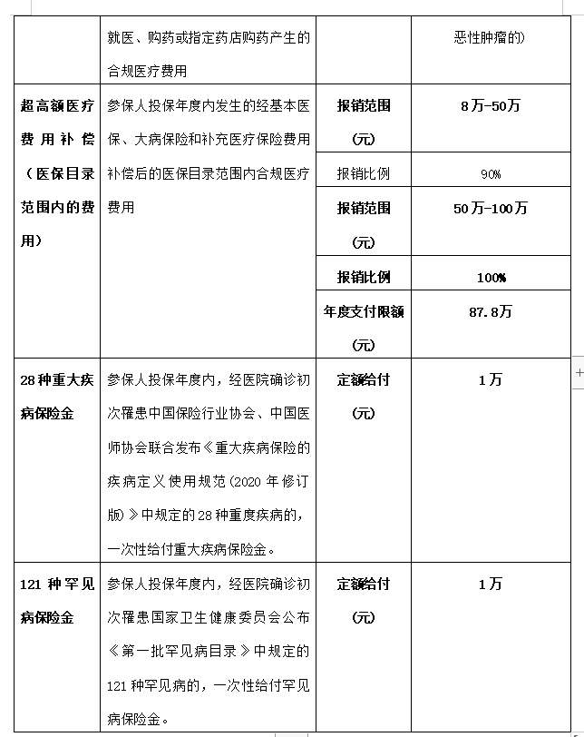 第四,超高额医疗费用补偿90%—100%。参保人投保年度内发生的经基本医保、大病保险和补充医疗保险费用三项补偿后的医保目录范围内合规医疗费用,累计范围在8万—50万元(含)的部分,报销90%;累计范围在50万-100万元(含)的部分,报销100%。