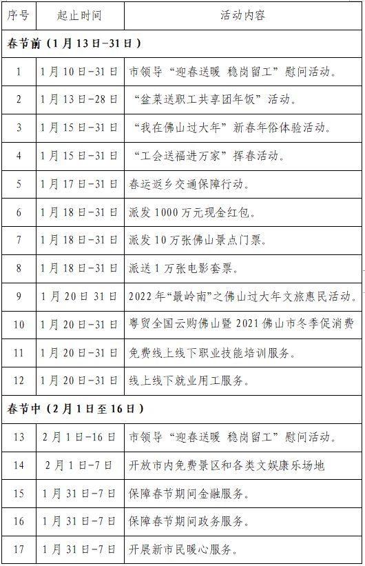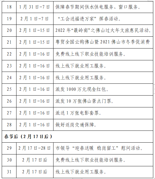 为向全市企业和广大异地务工朋友恭候新春,我们推出了五大礼包。一是“乐购”礼包。派发1000万元现金红包,提供10000人次新春剪发服务,推动超6000家商户参与各类促销活动。二是“畅游”礼包。派发10万张热门景点门票,举办过大年文旅惠民活动,推出90多项新春文旅惠民产品。三是“欢娱”礼包。发放10000张电影套票,组织电影放映队送电影进园区、企业、工地,举办“我在佛山过大年”新春年俗体验活动、家庭亲子活动、“幸运脱单”活动,免费开放各类文娱康乐场地。四是“慰问”礼包。派发超10000份年货慰问包,为坚守岗位的广大员工送上1000盆盆菜,开展“工会送福进万家”挥春活动。五是“服务”礼包。通过免费提供线上培训资源、发放技能提升补贴、加强就业用工服务对接、持续提供金融服务、政务服务中心“不打烊”等方式,提供暖心服务。值得一提的是,以上只是市一级第一阶段推出的五大礼包,各区也将同时推出相关礼包,可以说这次援企稳岗、留佛过年的礼包是诚意满满、包各位外来务工朋友、留佛过年的朋友满意。