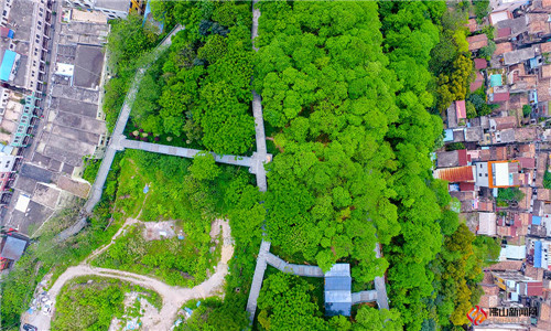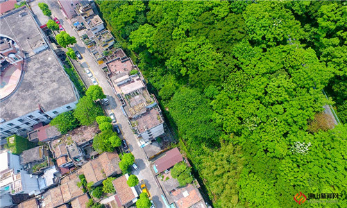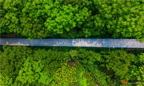 绿树繁茂,遮天蔽日,航拍图片看上去完全被绿色包围笼罩,满眼绿意。