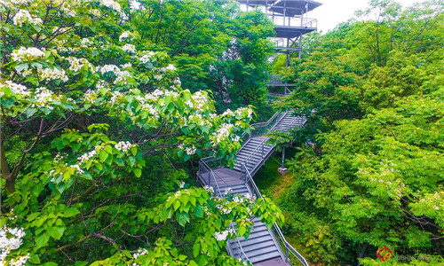 走在栈道上,两旁的树木郁郁葱葱,满眼的绿色让人心旷神怡。阳光透过叶子洒下来,白色小花朵朵绽放,栈道仿佛也充满了诗意。