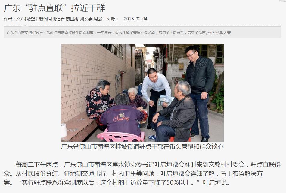 佛山市委书记刘悦伦说:“推行‘直联制’以来,群众反映的问题,97%都在镇(街)、村(居)层面得以解决,群众上访量大幅下降。”