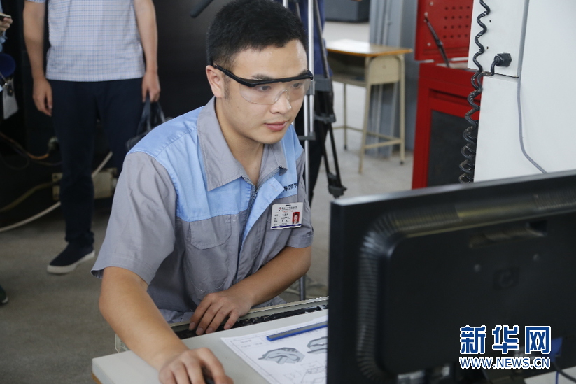 为挖掘佛山精益求精的工匠精神新亮点,努力探索其城市、产业与人相融合的治理和发展新思路新做法,6月22日,“佛山·大城工匠”采访团走访佛山,参观佛山市南海技师学院。图为技师谢海波在佛山市南海技师学院数控实训车间内演示操作数控铣设备。新华网 王明弘摄