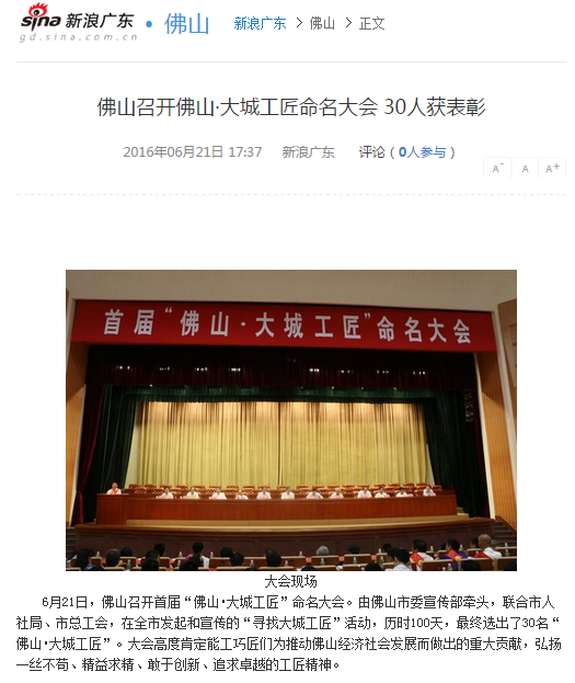 6月21日,佛山召开首届“佛山•大城工匠”命名大会。由佛山市委宣传部牵头,联合市人社局、市总工会,在全市发起和宣传的“寻找大城工匠”活动,历时100天,最终选出了30名“佛山•大城工匠”。大会高度肯定能工巧匠们为推动佛山经济社会发展而做出的重大贡献,弘扬一丝不苟、精益求精、敢于创新、追求卓越的工匠精神。