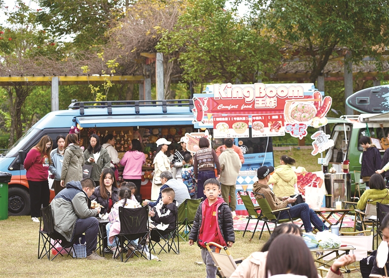 市民游客在桑果文化节的车尾箱集市围坐,品尝美食。/佛山市新闻传媒中心记者何淳伟摄