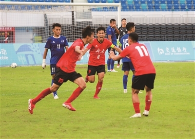 5月24日,全国第十二届残疾人运动会暨第九届特殊奥林匹克运动会聋人足球项目(十一人制男子组)决赛中,广东队以6比5战胜辽宁队,获得本届残特奥会夏季项目首金。图为广东队进球后队员欢呼。/佛山市新闻传媒中心记者周春摄