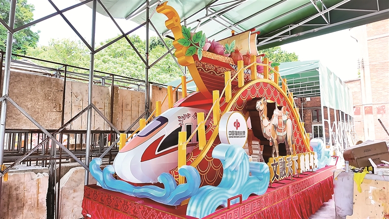 国家级非物质文化遗产(佛山彩灯)市级代表性传承人、高级工艺美术师陈志棠,站在一辆半成品彩车前介绍:“身后这辆是基地负责的第二辆主题彩车,目前还在制作中,只差装裱彩布、喷漆上色和最终组装工序。”第一辆彩车已经全部制作完成,插电后就可以使用。
