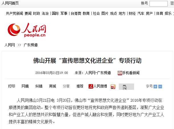 人民网佛山3月21日电 3月20日,佛山市“宣传思想文化进企业”2016年专项行动在顺德美的集团启动。整个专项行动旨在更好地将党和政府声音传递到基层,凝聚广大企业和产业工人的思想共识和智慧力量,促进产城人融合和发展,同时更好地为广大产业工人提供丰富的精神文化服务。