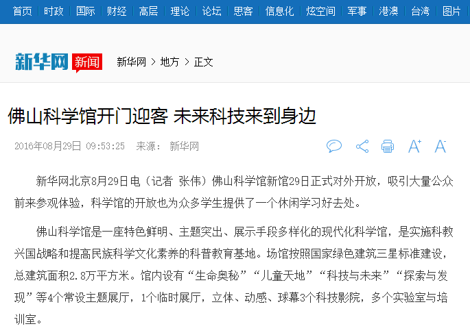 新华网北京8月29日电(记者 张伟)佛山科学馆新馆29日正式对外开放,吸引大量公众前来参观体验,科学馆的开放也为众多学生提供了一个休闲学习好去处。