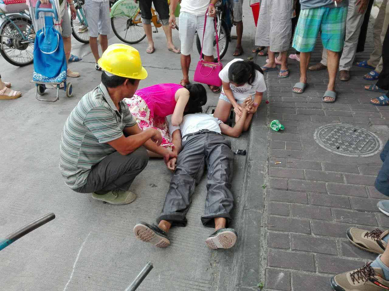 “红衣女子”刘茂英为傅文满做人工呼吸抢救(8月31日摄)。