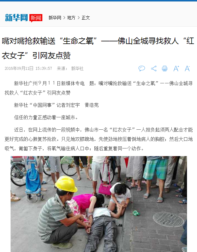 近日,在网上流传的一段视频中,佛山市一名“红衣女子”一人担负起须两人配合才能更好完成的心肺复苏抢救。只见她双膝跪地,先使劲地按压着倒地病人的胸腔;然后大口地吸气,匍匐下身子,将氧气输往病人口中;随后重复着同一个动作。