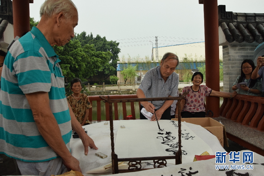 6月28日,禅城紫南村一位老人正在村中的凉亭中挥毫泼墨。新华网 王厚启摄
