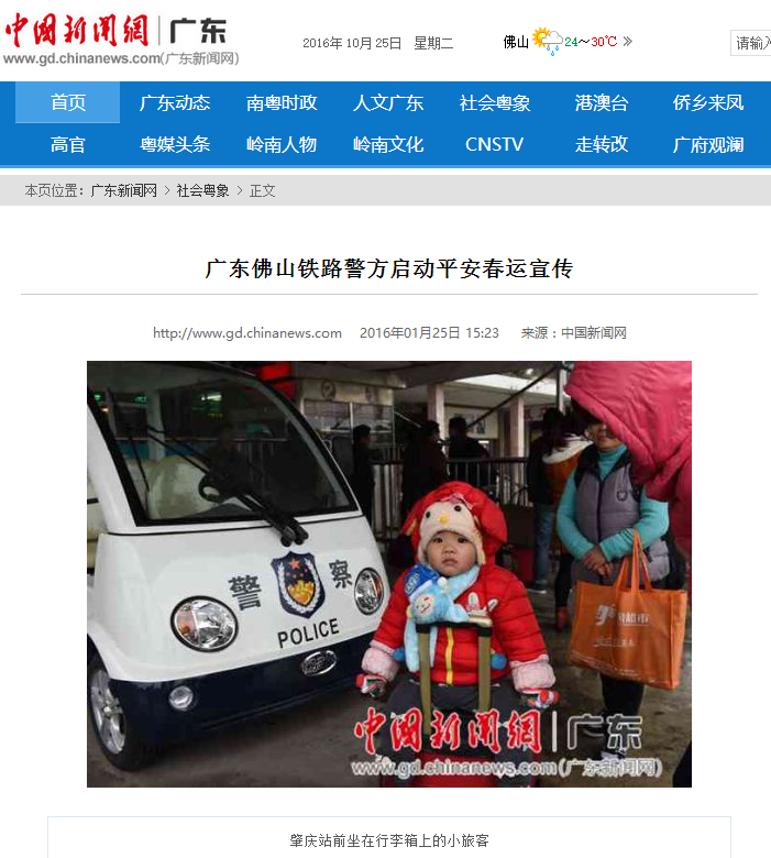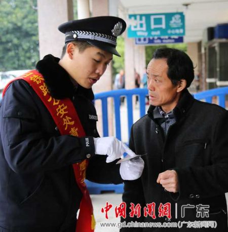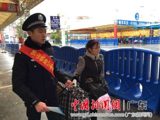中新网肇庆1月24日电 (黄耀辉 余仁峰 黄乐涛)广东佛山铁路警方24日在寒风细雨中启动2016年春运平安春运宣传,管内13个派出所和南广、贵广高铁线7个高铁站共320名民警、学警和辅警进行主题“平安、和谐、服务”的春运宣传。
