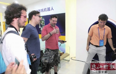 在广东工业设计城,外媒记者体验佛山企业研制的机器人设备。珠江时报记者/戚伟雄摄