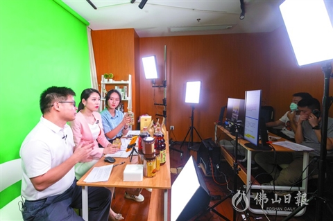 在昨晚举行的直播带货专场中,何国良(左一)在推介商品。/佛山日报记者符诗贺摄
