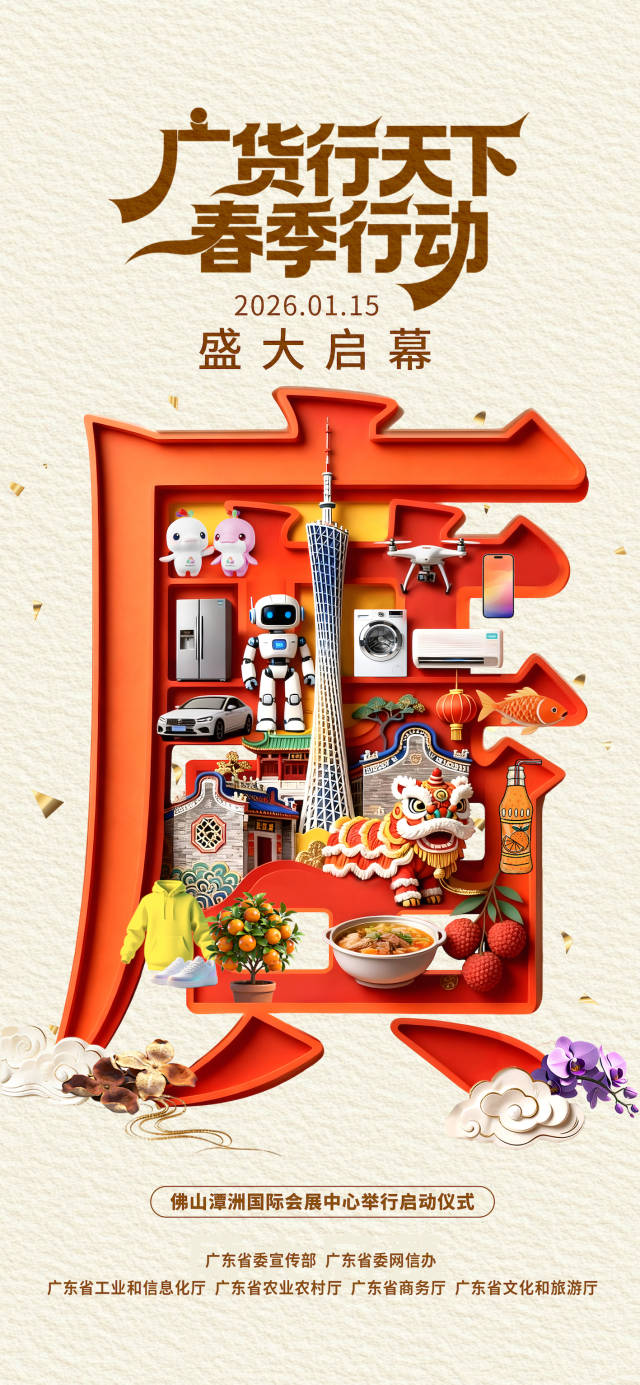 1月15日,“广货行天下”春季行动发布会暨家电专场促销活动将在佛山举行,正式拉开2026年度广东产品线上促销活动的序幕。其中,一季度将举行12场线上线下同步协同促销活动,并举办18场“广货行天下”春季行动系列配套活动。