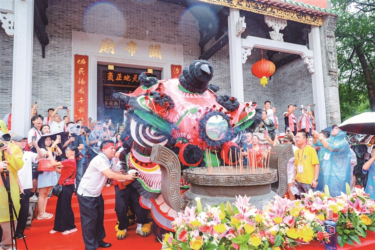 当天早上9时许,佛山水上关帝庙庙会正式拉开帷幕。汾江河面上四艘龙船破浪而来,宛如四条鲜活的巨龙游弋于碧波之上。一场别开生面的“英雄护关公”狮舞盛宴紧随其后。刘备、张飞、赵云、黄忠、马超等历史名将以雄狮的形象再现,守护着中央的关公狮步入庙宇。活动还为关公狮点睛、簪花挂红,寓意吉祥如意,鸿运当头。