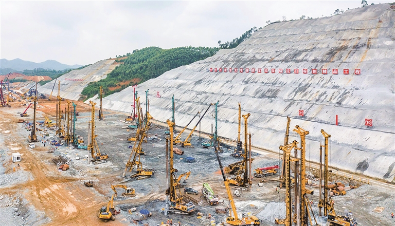 近日,记者来到广湛铁路珠三角枢纽机场站站前十四标的施工现场,见到一派热火朝天、昂扬向上的奋斗景象:长约1.4公里的施工现场,近千名施工人员挥汗奋战,数十台大型施工器械同步作业,一个对粤港澳大湾区未来发展举足轻重的大型交通枢纽正在佛山肇庆交界处的群山之中现出雏形。