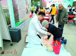 来自佛山志愿者学院医疗保健学院的医护人员们正在教一位老人如何进行急救。