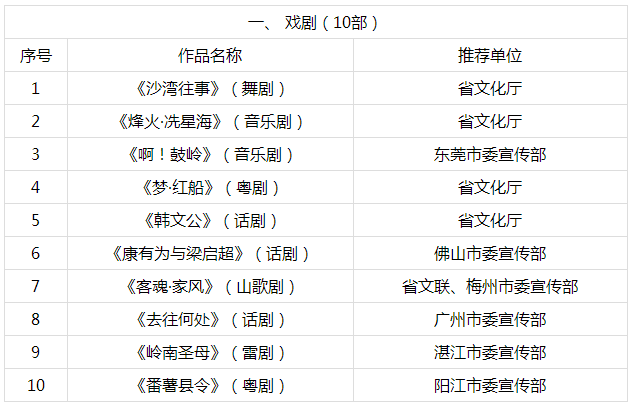 为推动文艺精品创作生产,促进文艺事业繁荣发展,省委宣传部近期组织开展了广东省第十届精神文明建设“五个一工程”评选工作。根据评选结果,确定了舞剧《沙湾往事》等56部作品作为广东省第十届精神文明建设“五个一工程”优秀作品。