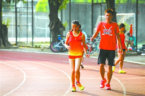 昨日,引导员引导视障运动员适应场地。 /佛山日报记者张弘弢摄