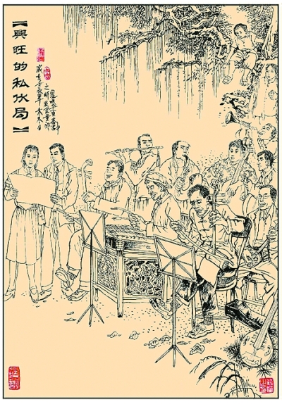 刘发良的顺德风俗画以白描为主。线是造型的基础,舍弃了色块的表现方式,仅仅用线来塑造体积是白描的难点。线的粗和细、流畅和停顿都是决定画面生动与否的关键。创作过程既要克服“雨里孤村雪里山,看时容易画时难”的窘境,又要力求达到粗中有细、由俗入雅和举重若轻的境界。
