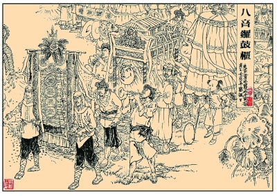 试看作品《八音锣鼓柜》,画中人物动态各异,作者着力描绘了前景队伍中人物与道具的细节,而虚化了远景,突出了重点,上下角落的留白处理使本来繁复、拥挤的画面变得透气,富有节奏。作品《凤岭朝辉》呈现了近、中、远三个景别,描绘了人们祈福的场景。画家以较粗的线条描绘近景中的树和人物,以较细线条塑造中景的建筑,相较近景和中景中较为肯定和笔直的线条,远景的线条更为随意,加之画面上方雾气烟云的衬托,观者的视线便可由下而上,由近到远,畅想更加高远的画外世界。以淡墨设色的作品《赛龙舟》则在场景气氛的营造上下足了功夫,飘动的彩带、龙舟划出的水波、围观的人群都烘托出比赛的激烈,喧天的锣鼓和运动员的振臂呐喊仿佛穿透画纸扑面而来。