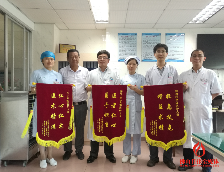 三水冠军城·天汇广场项目部为参与抢救的三个学科送来锦旗,感谢医务人员的全力救治和细心护理。该项目张经理表示,已为工人购买保险,段先生住院期间的治疗费用,都无需自己支付,项目方也将妥善处理他住院期间及事后的各项事宜。