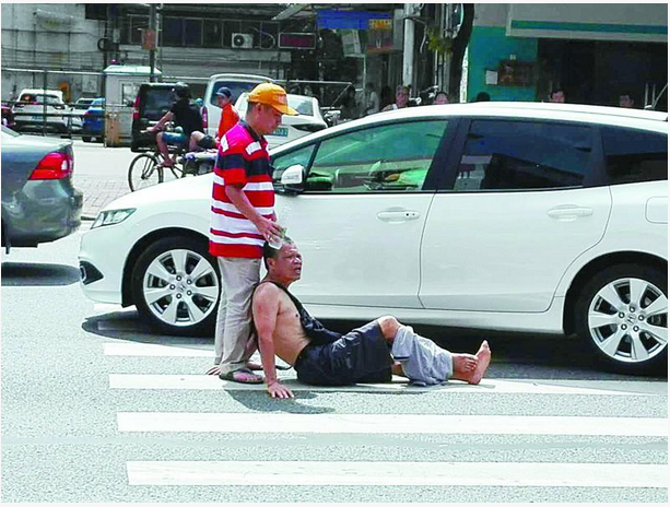 冼伯在过马路时不幸被白色小车撞倒,随后一名热心市民一直在其身旁守护,勾勒出一幅暖心画面。