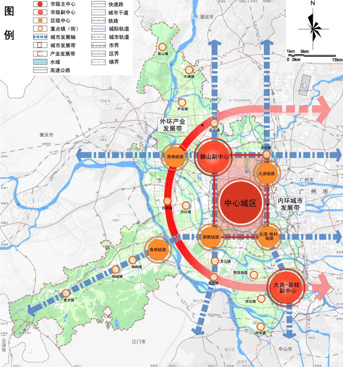 5个区级中心:指西南组团、高明组团、大沥组团、西樵组团、北滘-陈村组团,提升综合服务功能,带动周边镇(街)发展。