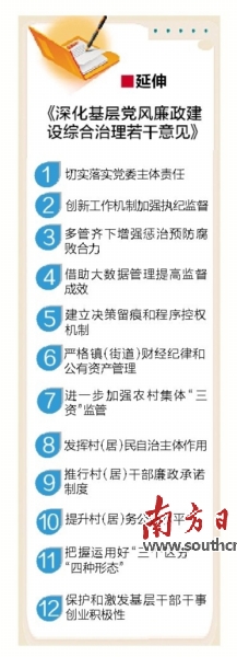 《意见》从纪律规矩意识、廉政风险防控、村(居)权力内部制约、基层干部履职担当等4个方面设立了12条意见,以此推动全面从严治党向基层延伸,营造基层风清气正、干事创业的良好氛围。