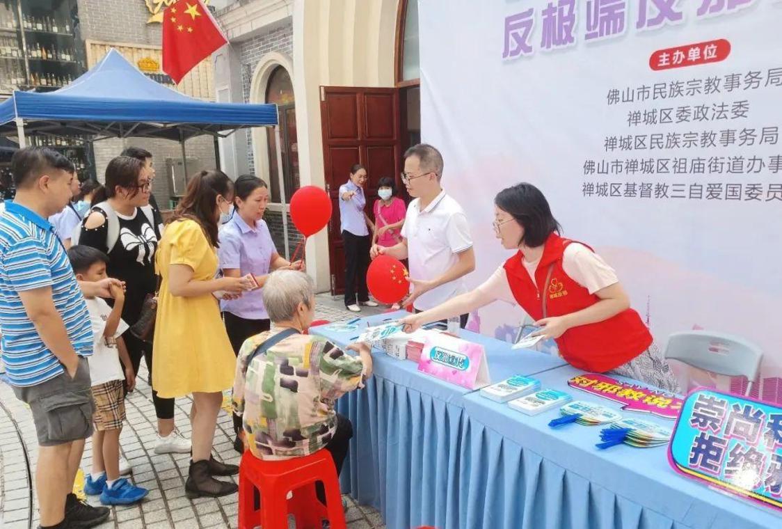 今年9月,在市委统战部指导下,市民族宗教事务局、禅城区委政法委、禅城区民族宗教事务局及禅城区基督教三自会在升平堂广场开展“学习宗教政策法规 反极端反邪教宣传”活动,向社区居民宣讲宗教极端思想的危害性。宣讲者们通过案例剖析宗教极端思想的本质特征、主要危害及防范要点,用通俗易懂的语言解答现场群众有关民族宗教的问题,引导群众自觉坚决反对宗教极端思想,对含有宗教极端思想的言论和信息做到不听、不信、不传,并积极向有关部门举报。