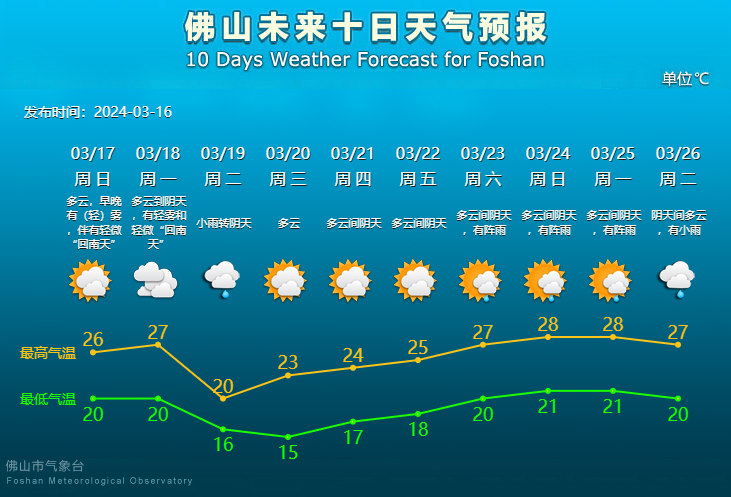佛山市气象台3月16日预报,预计17日至18日我市阴天转多云,早晚有(轻)雾,并伴有轻微“回南天”;气温上升,分别为20℃~26℃、20℃~27℃。未来两天温暖潮湿,需注意防潮、防滑,关闭门窗;雾时能见度低,需注意水陆交通安全。