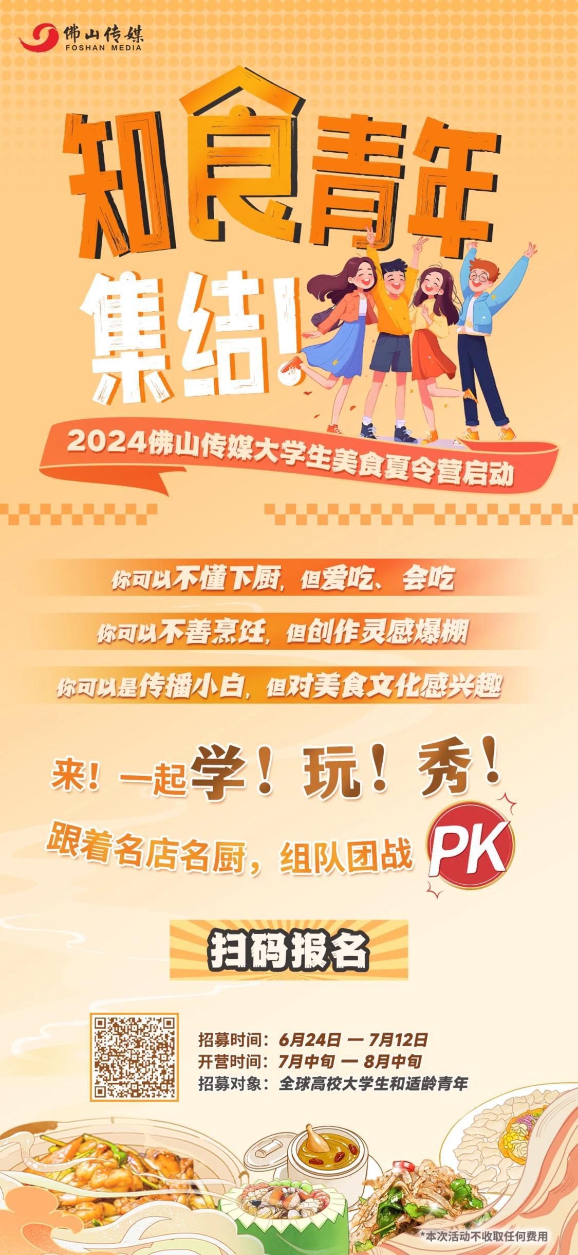 “2024佛山传媒大学生美食夏令营是以美食为主题,这是一个面向全球大学生的公益活动 ,不收取费用。”佛山传媒集团有限责任公司美食项目临时工作组副组长李炯聪介绍,今年夏令营希望能够吸引世界各地的年轻人,在“学、玩、秀”中传播文化、传唱城市。