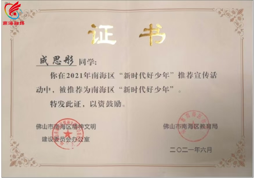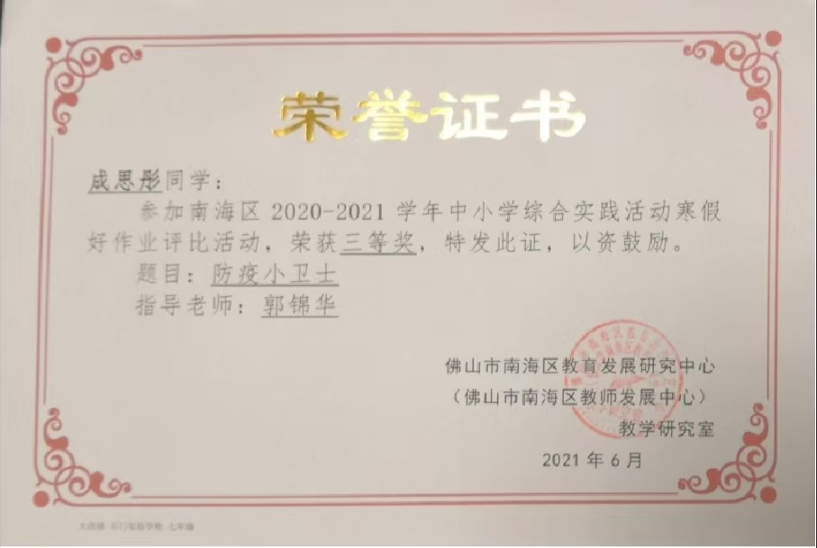 时光不负有心人。成思彤在成长路上收获了不少荣誉,包括2018-2019学年度佛山市优秀学生干部,2019-2020年度“广东省优秀少先队员”称号、2021年南海区“新时代好少年”、2022年第一季度佛山“新时代好少年”等。