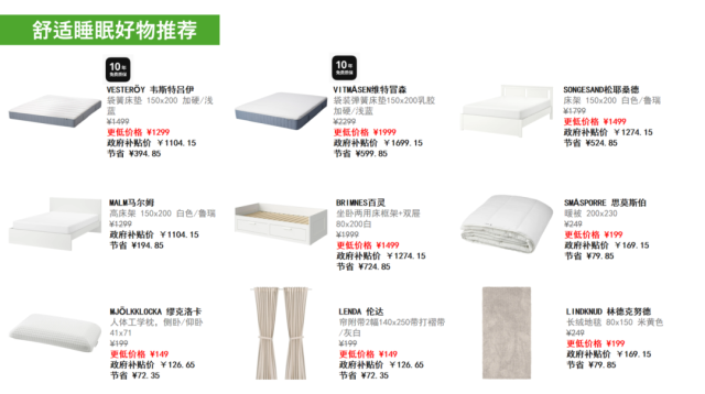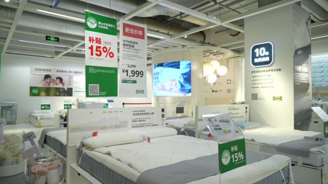 宜家家居佛山商场作为华南地区最大的宜家家居,为接住国补“流量”,结合去年政策的实施和市场的反馈,今年决定返场、加码补贴,即买1元以上产品就有补贴。同时,在去年的基础上,新增上千款补贴品类,涵盖睡眠、餐厨、收纳、办公等产品,尤其是去年热销的睡眠类产品几乎全线覆盖,而且叠加店内优惠后,单件商品最高可减免一千多元!