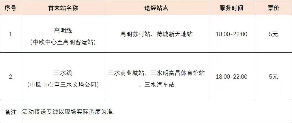 除了常规的公交线路外,还将开通2条活动接送专线以及7条公交临时接驳专线,加强活动终点、起点、签注点周边公交疏运能力,强化公共交通服务能力。