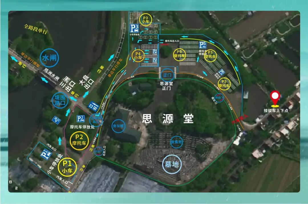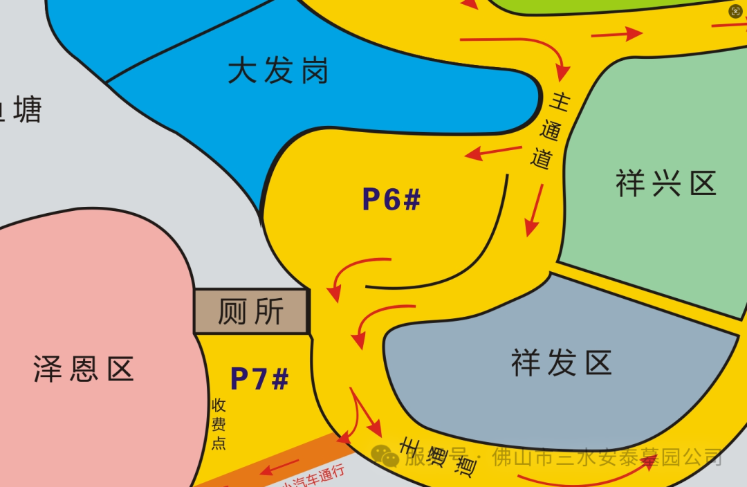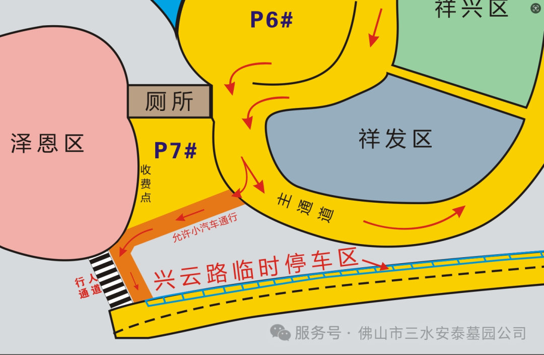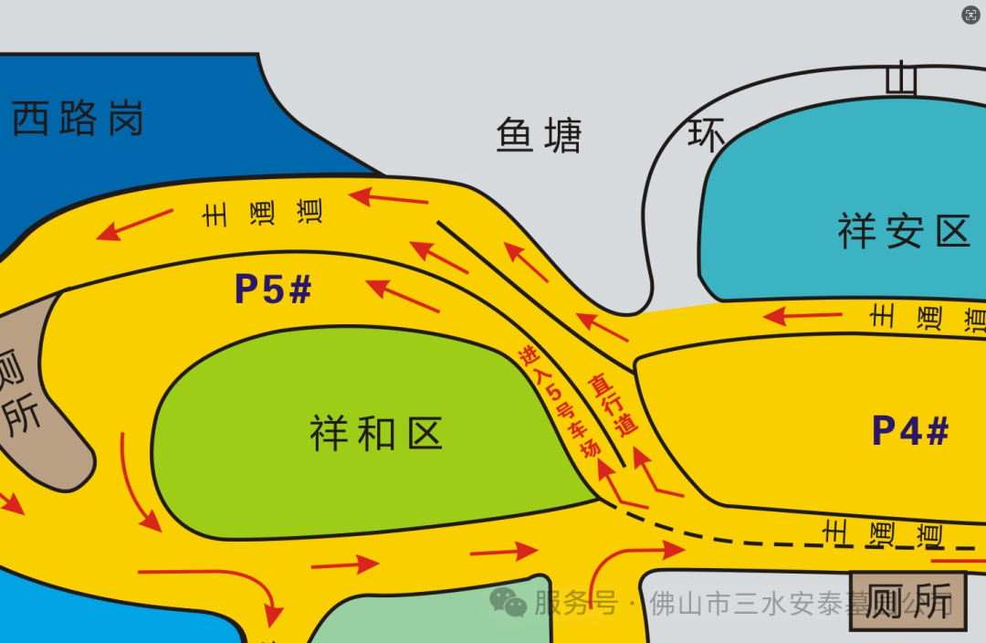 墓园内部5号、6号停车场实行提前分道行驶管理,市民需严格依照现场指示标志有序通行,具体分流指引如下: