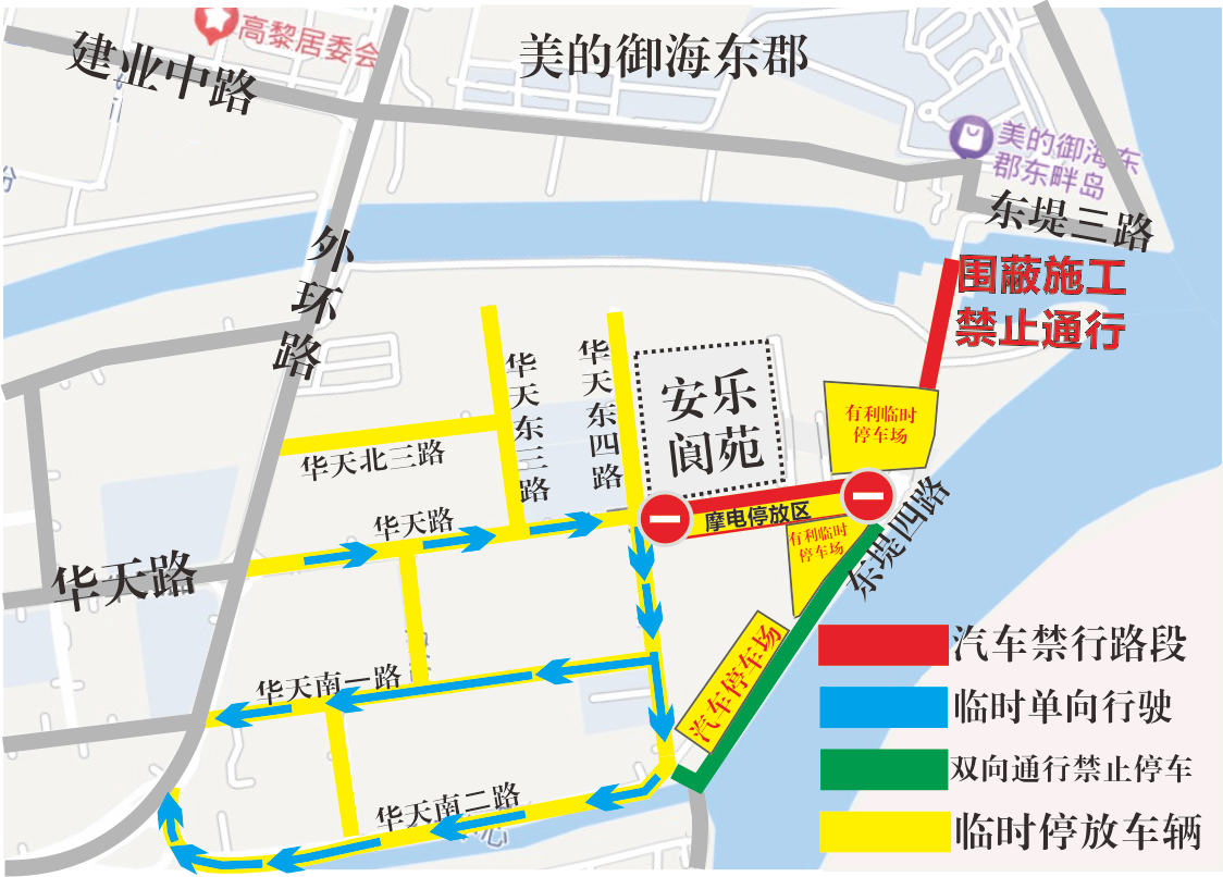 摩托车、电动自行车停放在华天路,小车可停放于华天路、华天东三路、华天北三路、东堤三路眉蕉尾水闸道路围蔽施工内等道路两侧停车位。