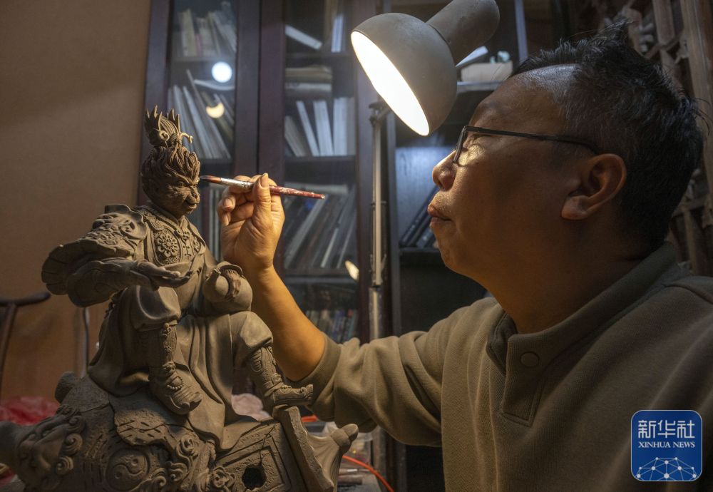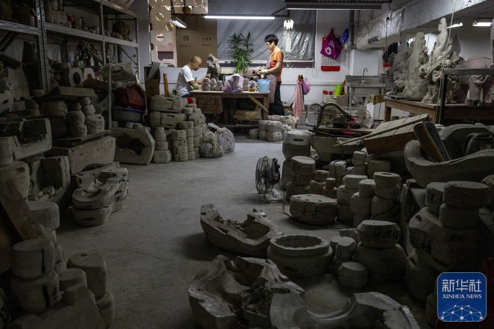 12月3日,在广东省佛山市美陶湾冯志伟陶塑设计室,一名工匠在打磨修坯。