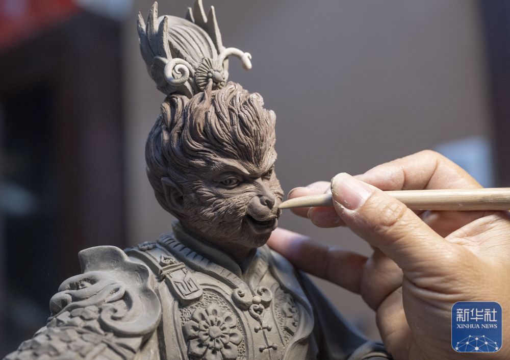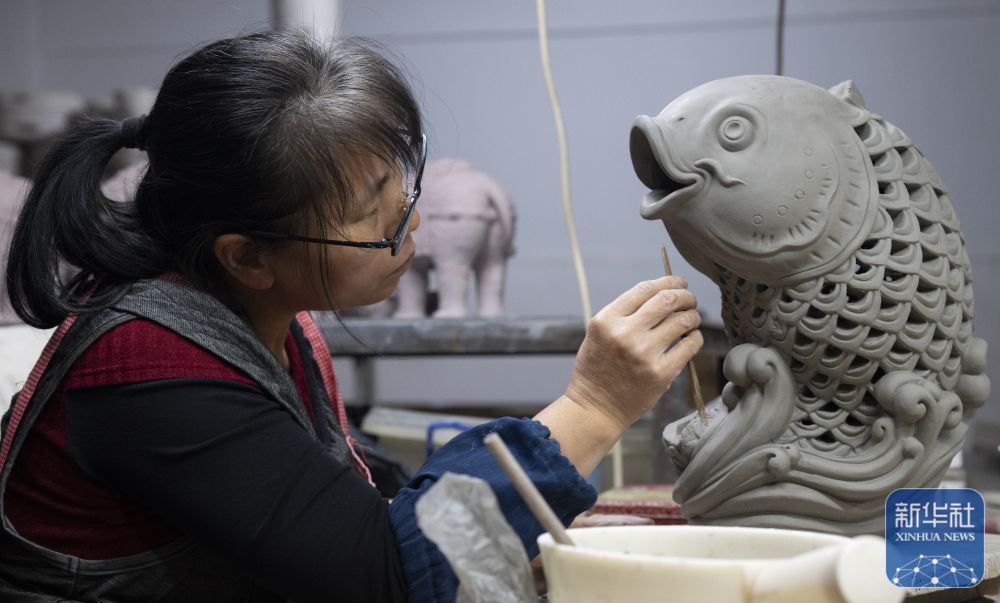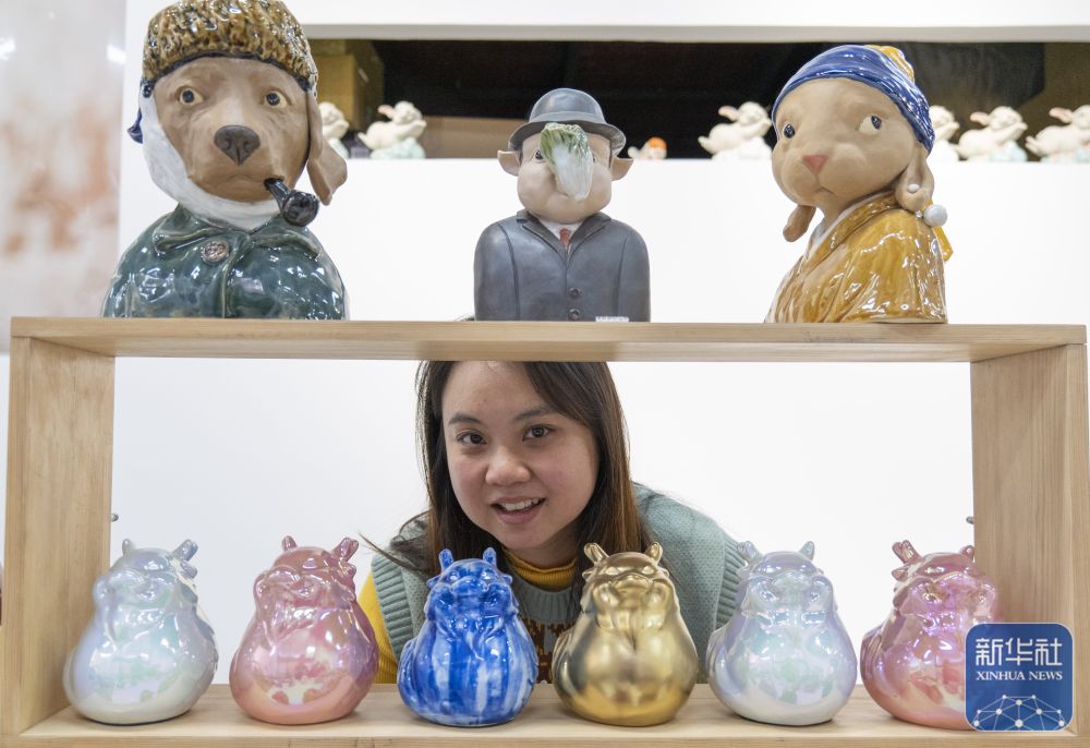 12月3日,在广东省佛山市美陶湾酉物工作室,工艺美术师黄炜介绍具有现代创意元素的陶塑作品。