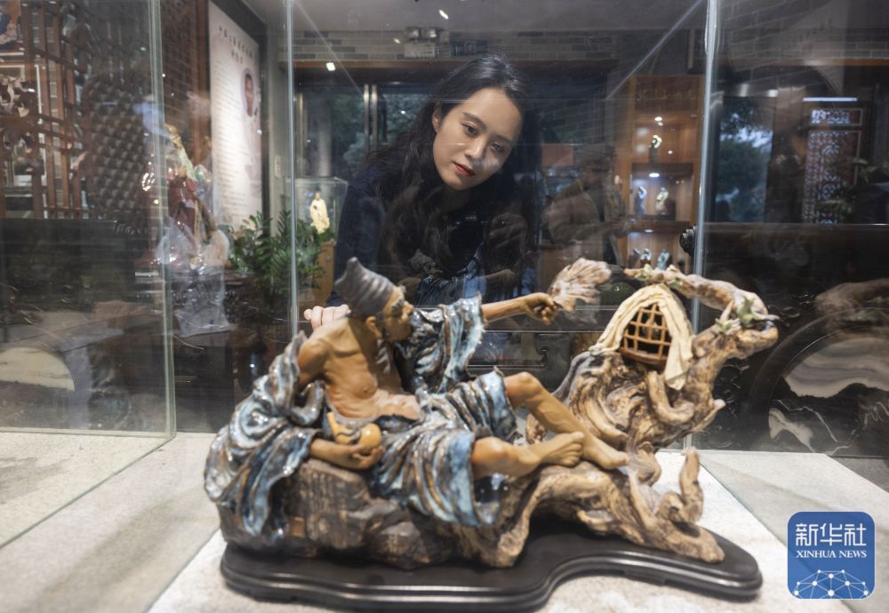 12月3日,在广东省佛山市美陶湾酉物工作室,佛山市陶瓷艺术大师、工艺美术师伍蔚蔚介绍具有现代创意元素的陶塑作品。