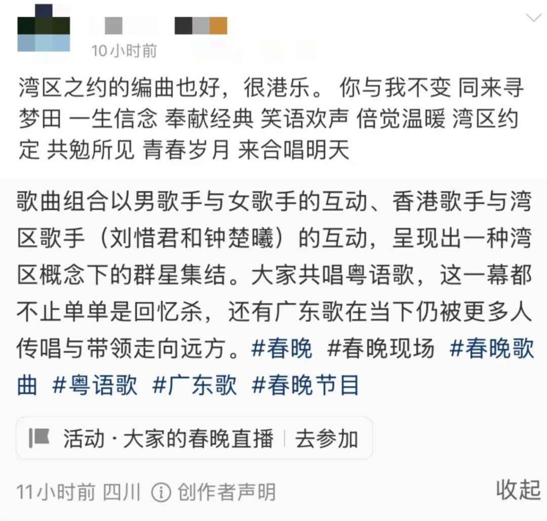 一首首粤语歌曲的经典流传,承载着普通人对积极进取、坚毅刚强、百折不挠精神的无限期许,也折射着大江南北的人们对于文化共同体的情感认知。在春晚的舞台上,粤语歌曲的传唱更是一种象征,象征着大湾区的发展和团结,将犹如歌曲一样代代接棒、代代传承,面向明天、再造辉煌。