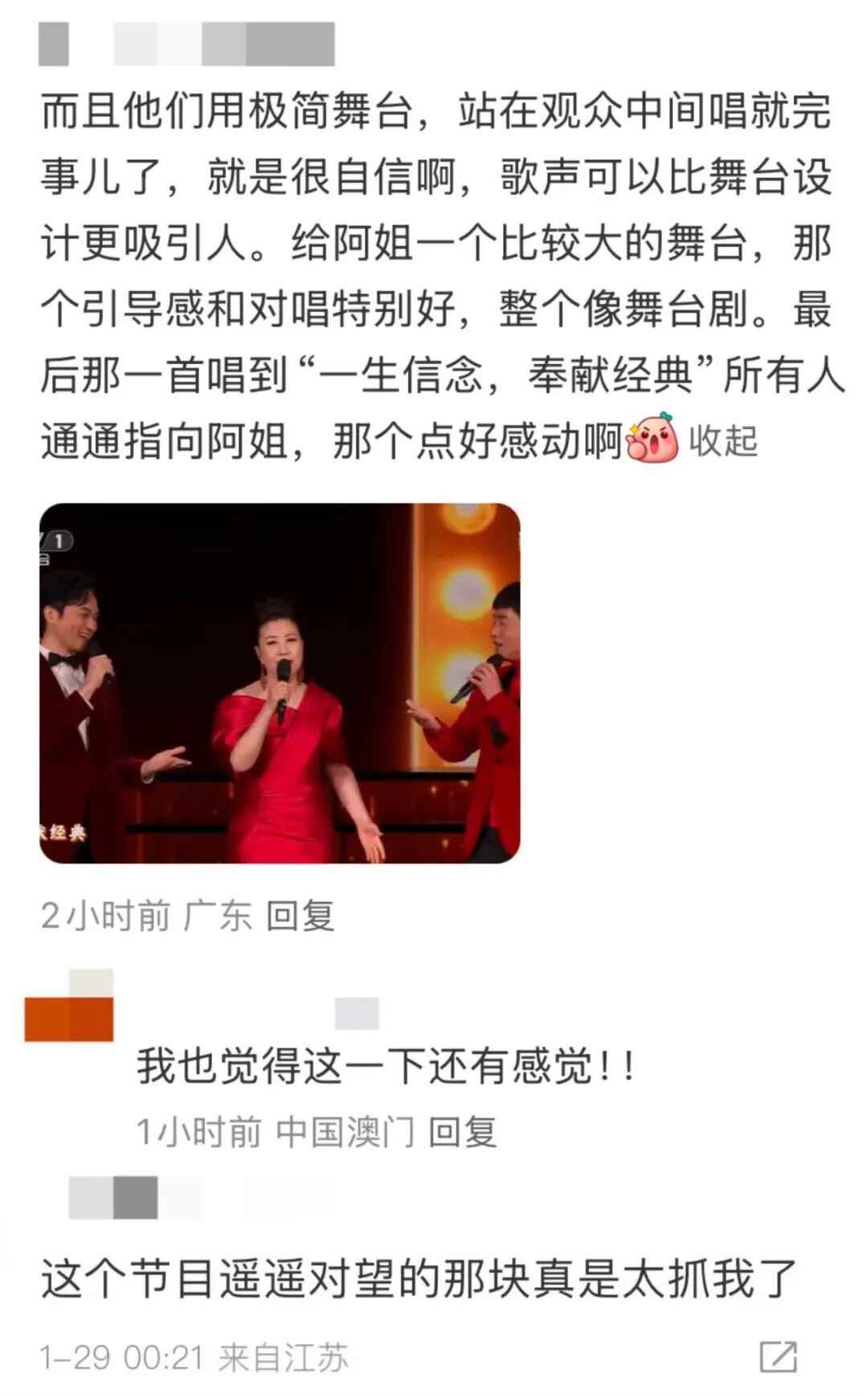创作团队重新设计调度方案,春晚总导演于蕾和副总导演赵大治,尝试在幕帘上用不同灯光营造简约的色彩团块,突出歌手轮廓、烘托氛围感。