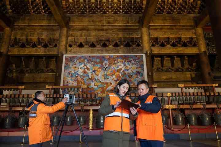 北京市测绘设计研究院团队在太庙测绘(2023年2月19日摄)。2020年9月起,北京市测绘设计研究院的技术团队开展了北京中轴线遗产点实地测绘,从文物保护、环境整治、文物腾退等方面为北京中轴线申遗提供空间数据底板。