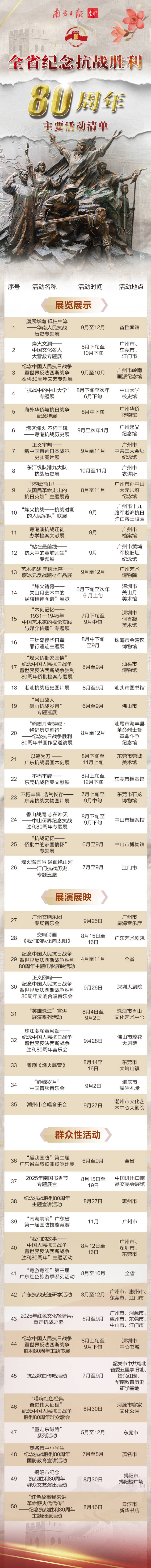 在中国人民抗日战争暨世界反法西斯战争胜利80周年之际,广东将开展系列专题研究、学术研讨,推出系列专题展览和优秀文艺作品展演,举办系列群众性活动,团结动员亿万南粤儿女更好地铭记历史、缅怀先烈,为强国建设、民族复兴作出新的更大贡献。
